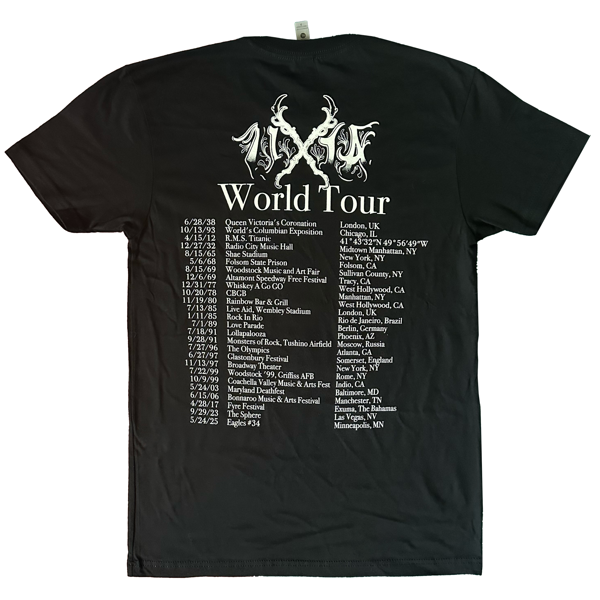 This shirt features the UXIA goat artwork on the front, and a sarcastic world tour date and venue list on the back.